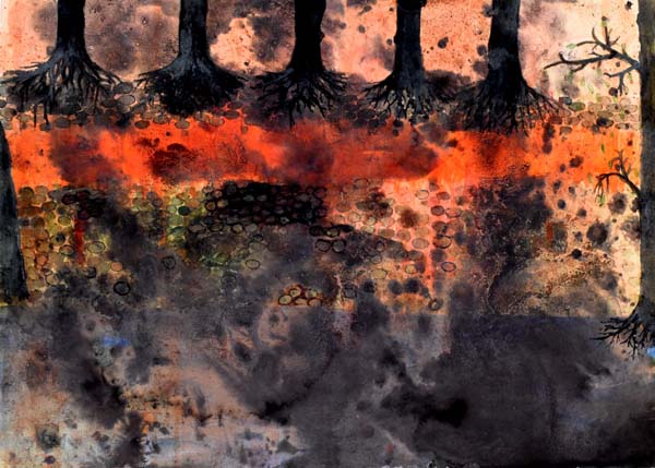 This enraged Nzame. He called Nzalang, the thunder, who arrived roaring and rumbling. And the fire of heaven set the forest ablaze. Fuui, Fuui, fuui, everything went up in flames. The trees burned, the plants, bananas, cassava, even the green almonds, all was laid in ashes. Animals, birds, fish, they were all dead. Everything had been destroyed.