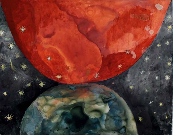 Every day the sun continues to chase his wife, the moon, and his children, the stars, across the sky. Incidentally he eats another of the stars. In the meantime mother moon does her best to protect her children. She warns them when the sun rises and takes them with her to her own hiding place.