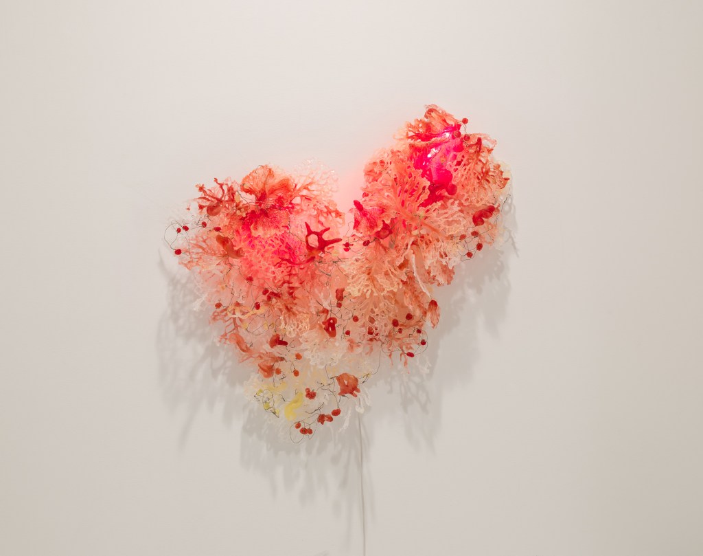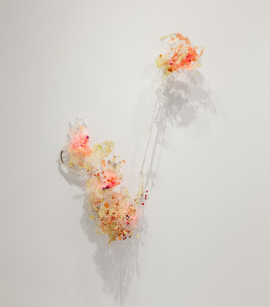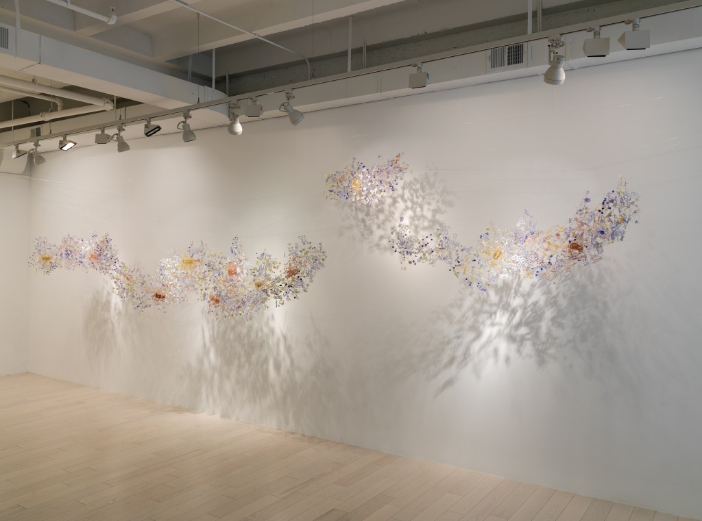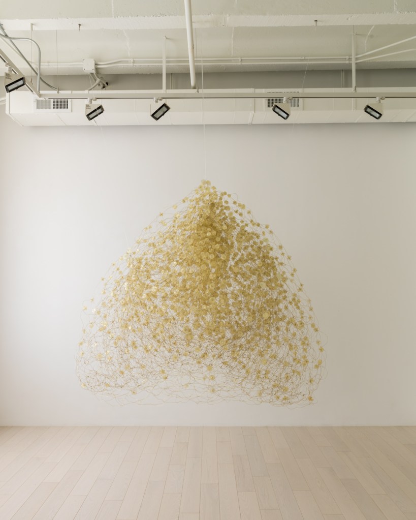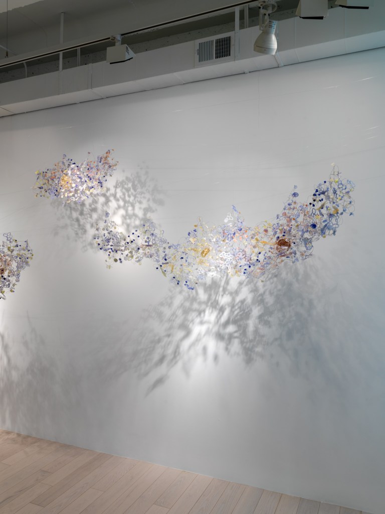 I would like to create an artwork that carries my fantasy hopes and dreams, yet reflects my complex emotional paradoxical feeling of nothingness through my Cloud artwork. I intentionally chose onions and potatoes as metaphorical substances to make my work. When we peel onion skins one after another, what are left are skins but nothing else. When we open a potato, there is nothing unlike when we open an apple. This reminds me of life itself. In order to make my sculpture, I peeled onion skins and sliced potatoes and dried them until they lost 90% of their moisture. What I discovered during the process was how beautiful the resulting aged skin was. I also was drawn towards the unexpected beautiful curvature of sliced potatoes and onion skin that occurred by reducing the moisture from the cells. After making a silicon rubber mold of the dried onion skins and sliced potatoes, I made a range of differently pigmented resin pieces. To me they are like individual cells. I made modules first by connecting four or five pieces with stainless steel wire without the use of sketches. It was quite like the chance operation John Cage mentioned for his work process. I then connect the modules together to discover the right matches. Gradually, a substantial shape emerged. My work tells me what to do next. I just follow. This process is similar to the growth of an organism.