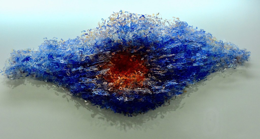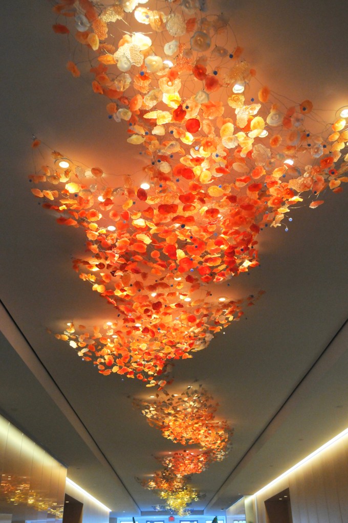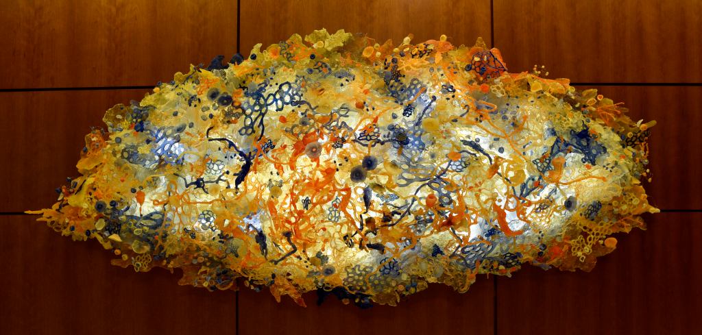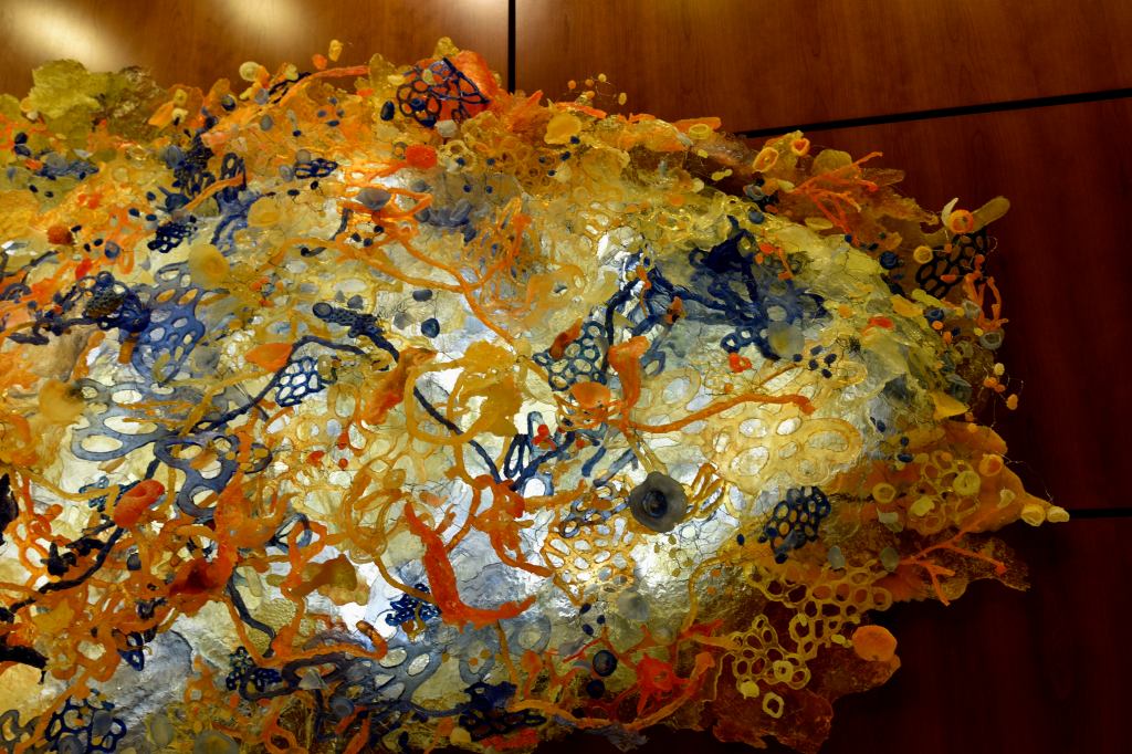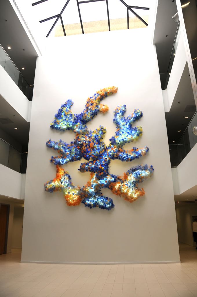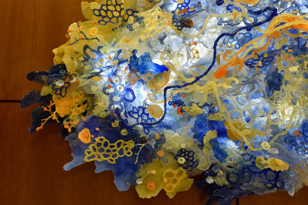 Sun & Water, 2015, Hand cast resin, stainless steel wire, LED lights. Jewish Federation of Greater Washington, Rockville, Maryland, 30′ x 20′ wall